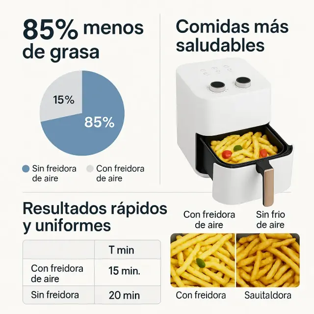 La Freidora de Aire X 5.5 Litros te permite preparar comidas crujientes y deliciosas usando hasta un 85% menos de grasa. Gracias a su sistema de circulación de aire caliente, obtienes resultados rápidos, uniformes y saludables.