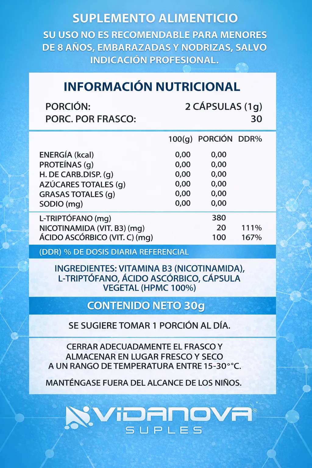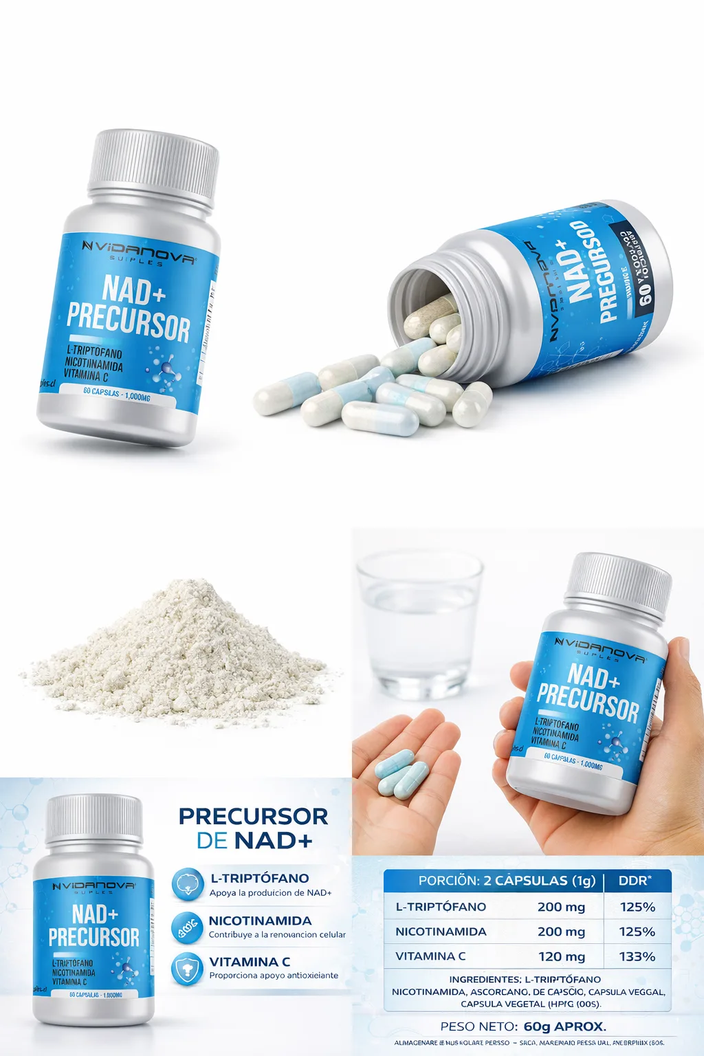 El nad precursor 1000mg es un suplemento en cápsulas diseñado para complementar tu rutina diaria. Contiene nicotinamida, L-triptófano y vitamina C en una fórmula práctica y fácil de consumir.
